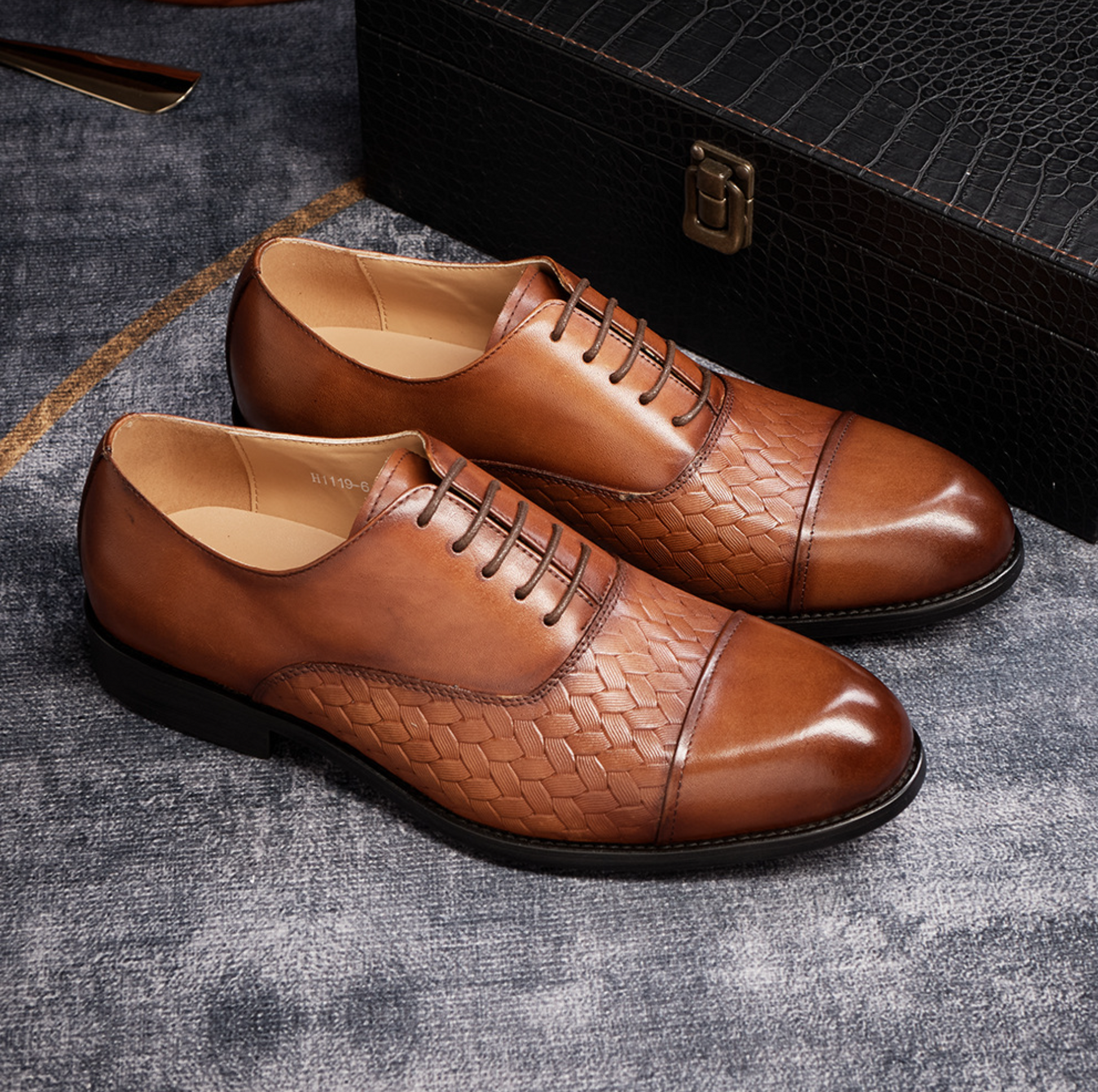 Step up your style with these Lux Leather Dress Shoes—made from real leather for a premium look and long-lasting quality. These dress shoes feature a unique woven texture and a classic cap-toe design, making them perfect for business, formal events, or everyday elegance. The soft leather lining keeps your feet comfortable all day, while the sturdy sole ensures durability and stability. Choose from sleek black for a sharp, polished look or rich brown for a warm, timeless style.