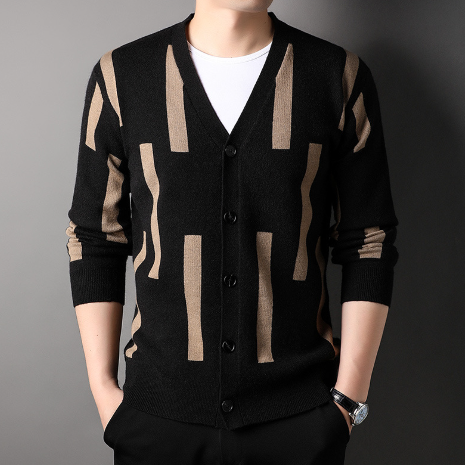 Upgrade your wardrobe with this sleek, modern cardigan designed for both style and comfort. Featuring a bold, abstract vertical stripe pattern, this is a versatile addition to any outfit. Whether dressed up for a refined look or layered for a casual ensemble, this cardigan delivers effortless sophistication. Crafted with soft, breathable fabric, it provides warmth without sacrificing style.