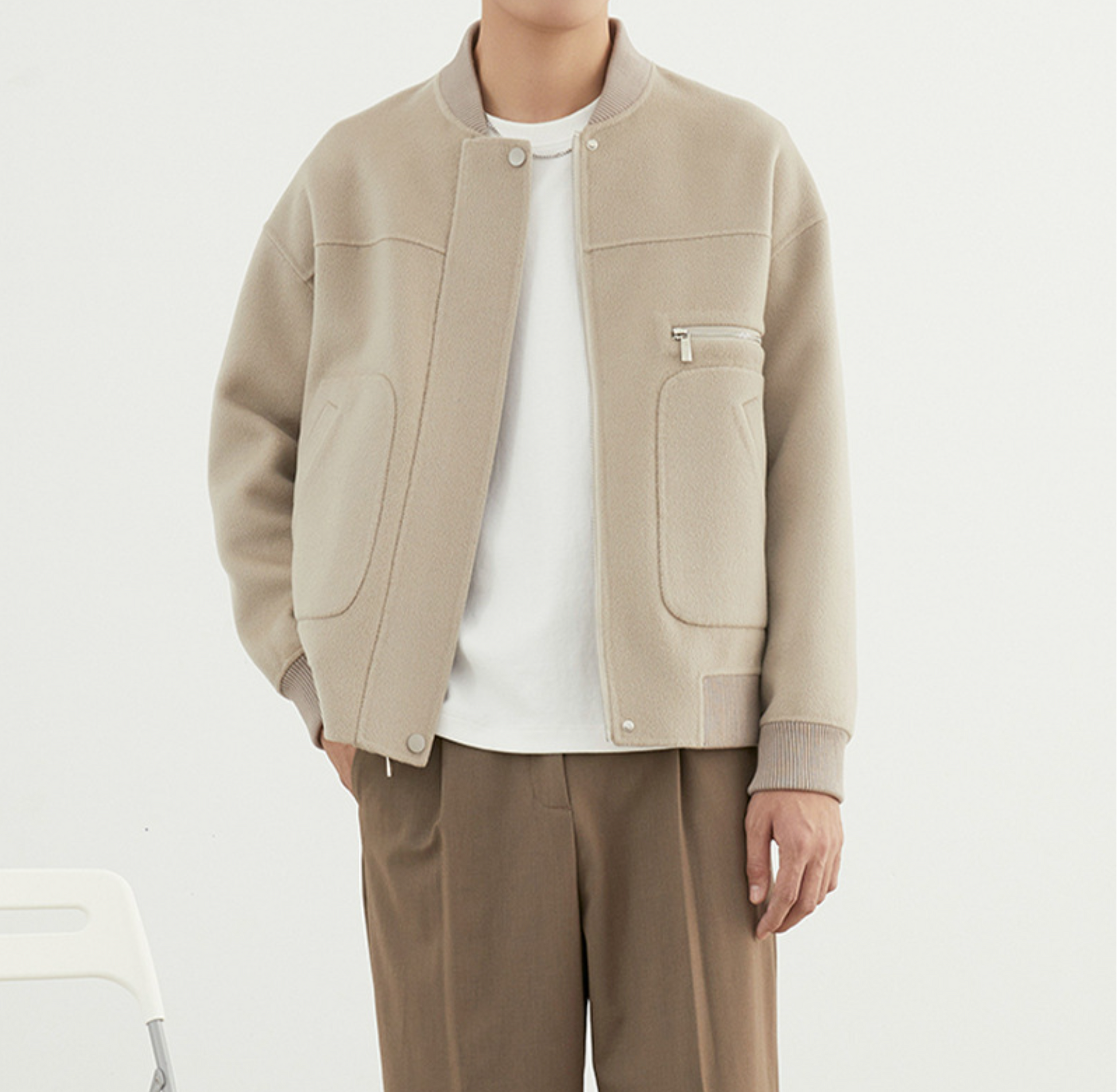 Add a touch of modern flair to your wardrobe with this wool bomber jacket. It’s cozy and warm, and its clean design goes well with jeans or dress pants. The zip pocket on the chest lets you store your phone or keys with ease.
